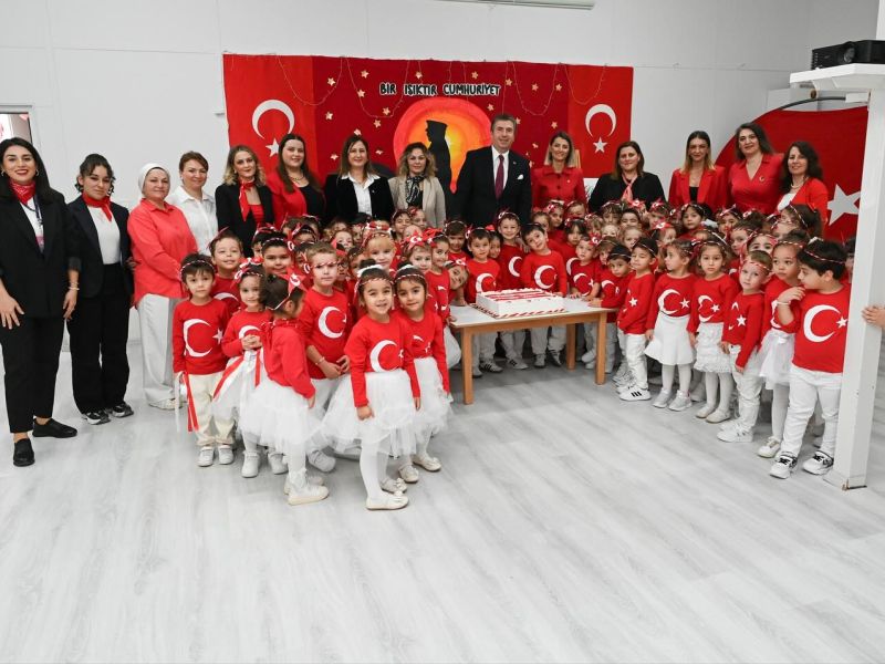 Minik öğrenciler, ellerinde Türk bayraklarıyla Cumhuriyet’e olan sevgilerini gösterirken, Başkan Güzel de çocuklarla birlikte marşlar söyledi ve etkinliklere katıldı.