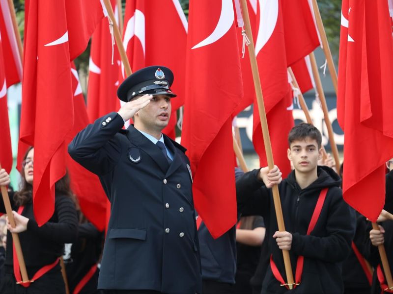 Atatürk Anıtı’na çelenklerin sunulmasının ardından, saat 09.05’te tüm ilçe siren sesleriyle birlikte saygı duruşunda bulundu, ardından İstiklal Marşı okundu.